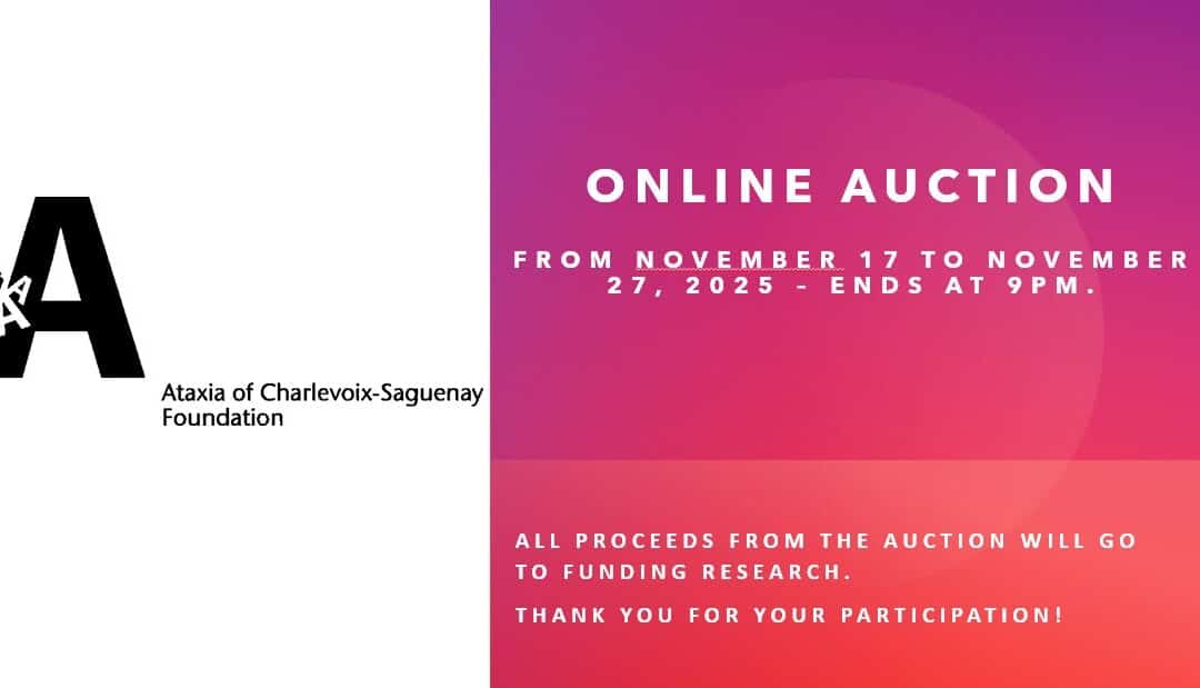 As part of the Diner des Producteurs 2025, an ideal opportunity to find exceptional lots while supporting ARSACS research. New this year: you can make a donation to fund directly a clinical trial for the Charlevoix Saguenay Ataxia.